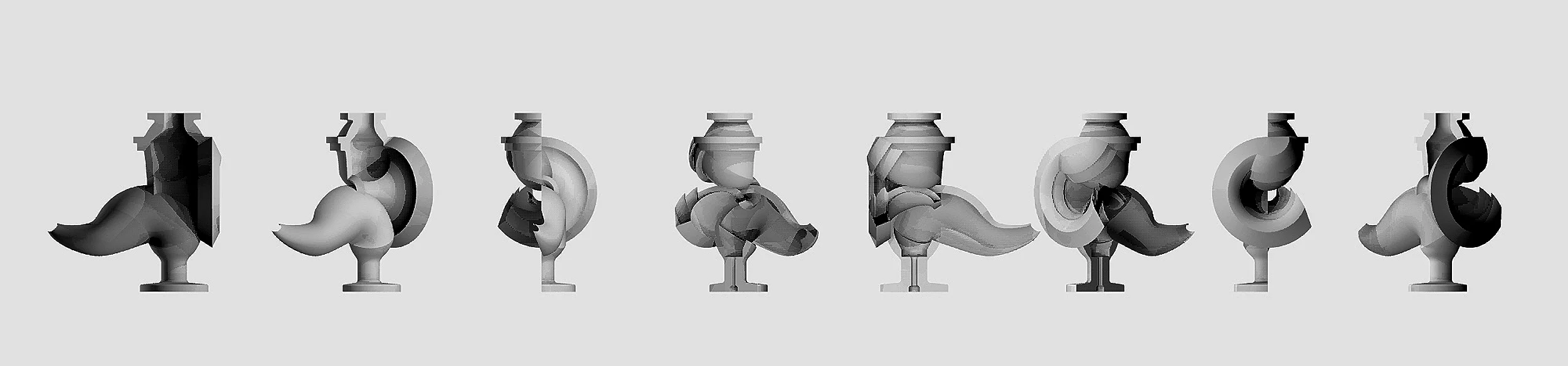 Objects are described first and foremost by their shape or configuration, with traits such as symmetries and different geometric volumes. Objects are also described through the processes used to generate them in virtual space. These traits are geometric manipulations of one form into another form. Examples of these traits include extrusions, booleans, and lofts.